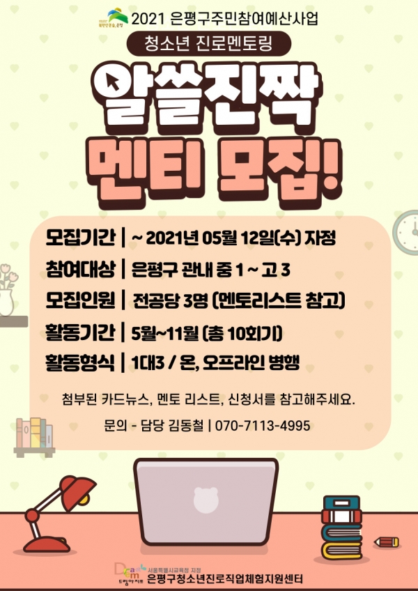 ¡à »ç ¾÷ ¸í : 2021 û¼Ò³â Áø·Î ¸àÅ丵 '¾Ë¾µÁøÂ¦'(¾Ë¾ÆµÎ¸é ¾µ¸ðÀÖ´Â Áø·Î¸àÅ丵 '¦±Ã') ¡à Âü¿©´ë»ó : ÀºÆò±¸ °ü³» ÁßÇб³ 1Çг⠺ÎÅÍ °íµîÇб³ 3Çгâ Çлý ¡à ¸ðÁýÀοø : Àü°ø´ç 3¸í ÃÑ 21¸í(ÁÖº¯ Ä£±¸µé¿¡°Ôµµ ÃßõÇÏ¿© ÇÔ²² Âü¿©Çϼ¼¿ä~) - ´ëÇлý¸àÅä ¸®½ºÆ®¿¡ ³ª¿Í ÀÖ´Â Àü°øº° Âü¿© °¡´ÉÇÑ Çгâ°ú ¼ºº°À» ²À È®ÀÎ ÈÄ ½ÅÃ»ÇØÁֽñ⠹ٶø´Ï´Ù. ¡à ¸ðÁý±â°£ : 2021. 5. 12.(¼ö) ÀÚÁ¤±îÁö - ¸ðÁý ±â°£ Á¾·á ÈÄ Âü°¡ È®Á¤ ¿©ºÎ °³º° ¿¬¶ôó·Î ¹®ÀÚ ¾È³»ÇÕ´Ï´Ù. - ¸ðÁýÀÌ ¹Ì´Þ µÈ Àü°øÀ» À§ÇØ nÂ÷ ¸ðÁý ÁøÇàµÉ ¼ö ÀÖ½À´Ï´Ù. - ƯÁ¤ Àü°ø¿¡ Âü°¡½Åû ÀοøÀÌ ÃʰúÇÑ °æ¿ì Âü°¡ÀÚ ¸éÁ¢ÀÌ ÁøÇàµÉ ¼ö ÀÖ½À´Ï´Ù.