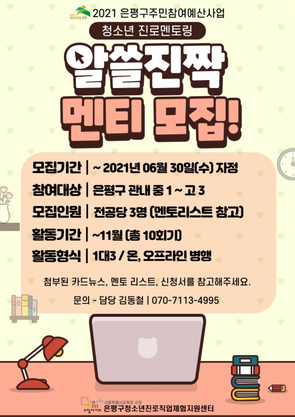¡à »ç ¾÷ ¸í : 2021 û¼Ò³â Áø·Î ¸àÅ丵 '¾Ë¾µÁøÂ¦'(¾Ë¾ÆµÎ¸é ¾µ¸ðÀÖ´Â Áø·Î¸àÅ丵 '¦±Ã') ¡à Âü¿©´ë»ó : ÀºÆò±¸ °ü³» ÁßÇб³ 1Çг⠺ÎÅÍ °íµîÇб³ 3Çгâ Çлý ¡à ¸ðÁýÀοø : Àü°ø´ç 3¸í - ÁÖº¯ Ä£±¸µé¿¡°Ôµµ ÃßõÇÏ¿© ÇÔ²² Âü¿©Çϼ¼¿ä~ - ´ëÇлý¸àÅä ¸®½ºÆ®¿¡ ³ª¿Í ÀÖ´Â Àü°øº° Âü¿© °¡´ÉÇÑ Çгâ°ú ¼ºº°À» ²À È®ÀÎ ÈÄ ½ÅÃ»ÇØÁֽñ⠹ٶø´Ï´Ù. ¡à ¸ðÁý±â°£ : 2021. 06. 30 (¼ö) ÀÚÁ¤±îÁö - ¸ðÁý ¿Ï·á ÈÄ ¸àÅä¿Í ¸àƼ°¡ Áø·Î¼¾ÅÍ¿¡¼ ¸¸³ª ¿¬°£ ÀÏÁ¤À» °èȹÇÕ´Ï´Ù. ¡à Ȱµ¿±â°£ : 2021³â ~ 11¿ù ÃÑ 10ȸ±â ¿¹Á¤ (Á¤È®ÇÑ ¸àÅ丵 ÀÏÁ¤°ú Ȱµ¿ ³»¿ëÀº ´ëÇлý ¸àÅä¿Í ÇÔ²² °èȹÇÕ´Ï´Ù) ¡à Ȱµ¿³»¿ë : Àüü ¿À¸®¿£Å×ÀÌ¼Ç ´çÀÏ ¸àÅä¿Í ³íÀÇ ÈÄ ¸àÅ丵 Ȱµ¿ °èȹ ¼ö¸³ (´ë¸é/ºñ´ë¸é Ȱµ¿ º´Çà) - ¸àÅä¿Í ¸àƼÀÇ ³íÀǸ¦ ÅëÇÑ ¸ÂÃãÇü Áø·Î ¸àÅ丵 - ´ëÇлý(¸àÅä)°ú û¼Ò³â(¸àƼ) 1:3À¸·Î ¸ÅĪ ÇÏ¿© ¿î¿µ - Àü°ø Ž»ö, ´ëÇб³ Ž¹æ, ¹®È»ýȰ, È¿°úÀûÀÎ °øºÎ¹ý, ÀԽà »ó´ã µî - 11¿ù 13ÀÏ(Åä) Àüü Ȱµ¿ º¸°íȸ : ¿ì¼ö ¸àÅä, ¸àƼ ½Ã»ó ¡à ¸ðÁýÁßÀÎ ¸àÅ丵 : ➀¾ÈÀü°øÇаú ¨èÇǾƳë Àü°ø ➂°ø°£Á¤º¸°øÇаú ➃»ç¹ü´ëÇÐ ±³À°°øÇаú ➄»çȸ±³À°°ú ➅°£È£Çаú ¡à Âü °¡ ºñ : ¹« ·á ¡à ¿À¸®¿£Å×ÀÌ¼Ç : Âü°¡ÀÚ ¸ðÁý ¿Ï·á ÈÄ - Âü°¡ÀÚ ¸ðÁý ¿Ï·á ÈÄ ¾È³» Áø·Î¼¾ÅÍ¿¡¼ °³º°·Î ´ã´çÀÚ¿Í ÁøÇà - ¼¾ÅÍ ÁÖ¼Ò : ¹é·Ã»ê·Î 4±æ 16 2Ãþ Áø·Î¼¾ÅÍ ¡à Á¦Ãâ¹æ¹ý : Âü°¡ Èñ¸Á ÇлýÀº ¸àƼ½Åû¼ ÀÛ¼ºÇÏ¿© e¸ÞÀÏ·Î ½Åû¼ Á¦Ãâ ( epdreamazit@daum.net ) ¹®ÀÇ) ´ã´ç ±èµ¿Ã¶ 070-7113-4995 ¶Ç´Â epdreamazit@daum.net |