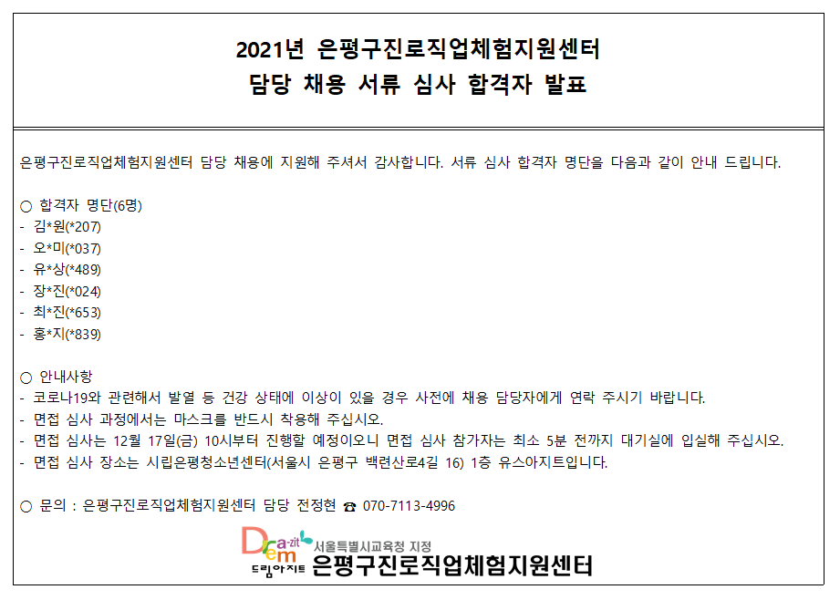 | ÀºÆò±¸Áø·ÎÁ÷¾÷üÇèÁö¿ø¼¾ÅÍ ´ã´ç(°è¾àÁ÷) ä¿ë ¼·ù ½É»ç ÇÕ°ÝÀÚ ¹ßÇ¥ | ||