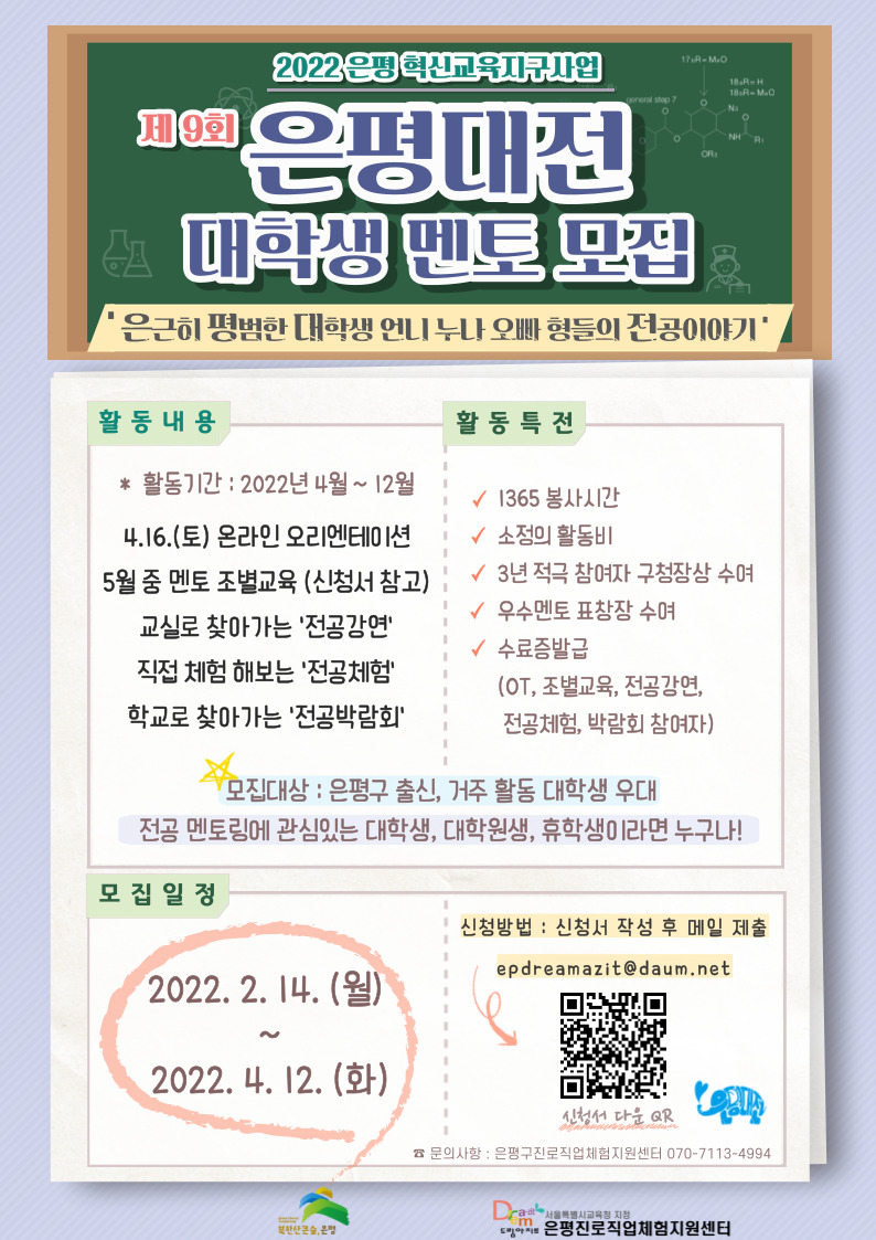 | 2022 ÀºÆò Çõ½Å±³À°Áö±¸»ç¾÷ Á¦ 9ȸ ¡¸ÀºÆò´ëÀü ¡¹¿¡ Âü¿©ÇÒ ´ëÇлý ¸àÅ並 ¸ðÁýÇÕ´Ï´Ù!! | ||||||||||||||