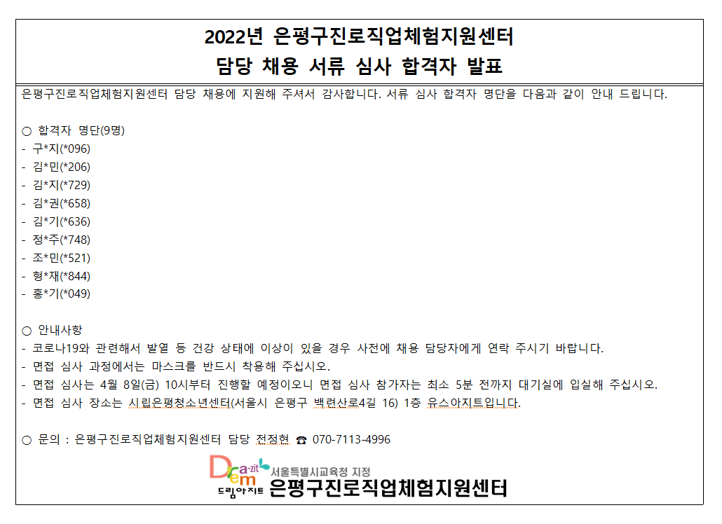 | ÀºÆò±¸Áø·ÎÁ÷¾÷üÇèÁö¿ø¼¾ÅÍ ´ã´ç(°è¾àÁ÷) ä¿ë ¼·ù ½É»ç ÇÕ°ÝÀÚ ¹ßÇ¥ | ||