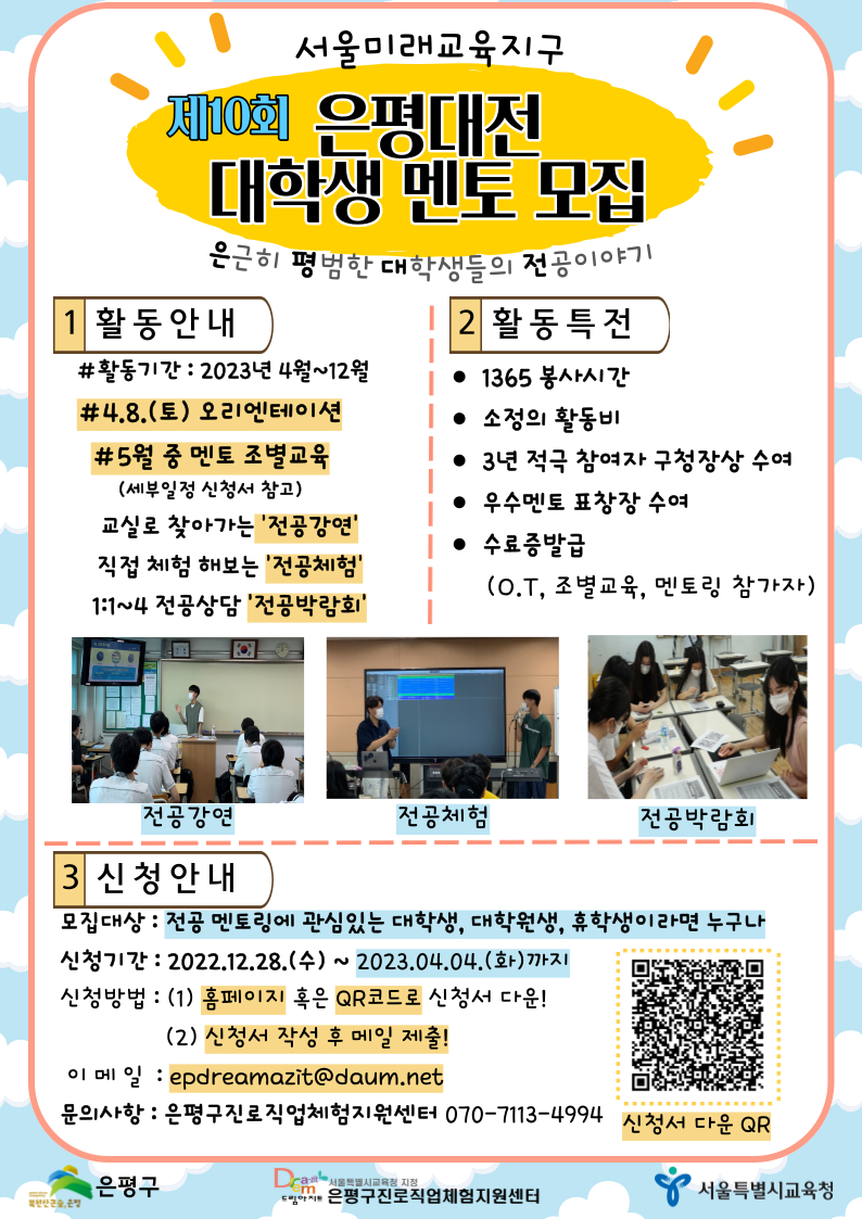ÀºÆò±¸Áø·ÎÁ÷¾÷üÇèÁö¿ø¼¾ÅÍ¿¡¼ Àü°ø ¸àÅ丵¿¡ °ü½ÉÀÖ´Â ´ëÇлý ¸àÅ並 ¸ðÁýÇϰí ÀÖ½À´Ï´Ù. ÀúÈñ ÀºÆò±¸Áø·ÎÁ÷¾÷üÇèÁö¿ø¼¾ÅÍ(ÀÌÇÏ ÀºÆòÁø·Î¼¾ÅÍ)´Â '¼¿ï½Ã±³À°Ã»'°ú 'ÀºÆò±¸'°¡ Çù¾àÇÏ¿© '»çȸº¹Áö¹ýÀÎ ¿£Á©½ºÇìÀ̺ì'¿¡¼ À§Å¹ ¿î¿µÇϰí Àִ û¼Ò³â Áø·Î Á÷¾÷ üÇè ¹× ±³À°Áö¿ø °ø°ø±â°ü ÀÔ´Ï´Ù. ¿ÃÇØ 10³âÀ» ¸ÂÀÌÇÑ ÀºÆò´ëÀü »ç¾÷Àº 'Àº±ÙÈ÷ Æò¹üÇÑ ´ëÇлýµéÀÇ Àü°øÀ̾߱â'¶ó´Â ÁÙÀÓ¸»·Î ´ëÇлý ¸àÅä, û¼Ò³â ¸àƼÀÇ ¸¸Á·µµ°¡ ¸Å¿ì ³ôÀº ÀºÆò±¸ ´ëÇ¥ Áø·Î¡¤ÁøÇÐÁö¿ø »ç¾÷ÀÔ´Ï´Ù.