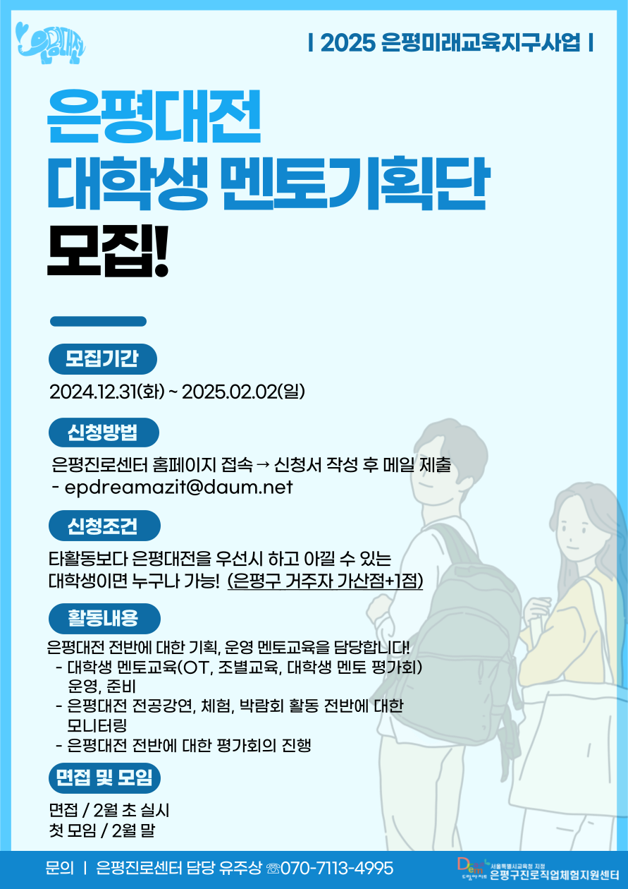¡ß ¸ðÁý±â°£: 2024³â 12¿ù 31ÀÏ(È) ~ 2025³â 02¿ù 02ÀÏ(ÀÏ) 24:00±îÁö ¡ß ¸éÁ¢ÀÏÁ¤: 2025³â 02¿ù 06ÀÏ(¸ñ) ~ 2025³â 02¿ù 08ÀÏ(Åä) Áß ½Ç½Ã ¡Ø ù ¸ðÀÓÀº 02¿ù 17ÀÏ(¿ù) ~ 02¿ù 22ÀÏ(Åä) Áß ½Ç½Ã ¿¹Á¤ ¡ß ½É»ç¾È³»: ÀºÆò´ëÀüÀ» ÇÔ²² ±âÈ¹ÇØº¸°í ½ÍÀº Ã¥ÀÓ°¨¡¤¸®´õ½Ê ÀÖ´Â ÀÚ 1Â÷ ½Åû¼ ±â¹Ý ¼·ùÆò°¡ ¡æ 2Â÷ ¸éÁ¢(´ëÈ ±â¹Ý) ¡æ ÇÕ°Ý¿©ºÎ °³º°¿¬¶ô ¡ß Ȱµ¿³»¿ë: ¸àÅä±³À°(O.T, Á¶º°±³À°, ´ëÇлý ¸àÅä Æò°¡È¸) ±âȹ ¹× ¿î¿µ / Àü°ø°¿¬-üÇè-¹Ú¶÷ȸ Ȱµ¿ Áغñ ¹× ¸ð´ÏÅ͸µ / ÇÁ·Î±×·¥ Àü¡¤ÈÄ ±âȹ¡¤Æò°¡È¸ÀÇ, ±× ¿Ü Ä£¸ñ¸ðÀÓ µî ¡ß Áö¿ø¹æ¹ý: ¾Æ·¡ ½Åû¼ ÀÛ¼º ÈÄ À̸ÞÀÏ Á¦Ãâ (epdreamazit@daum.net) ¡Ø ¼±Âø¼ø Á¢¼ö°¡ ¾Æ´Ñ, ½Åû¼¿Í Áö³ Ȱµ¿³»¿ëÀ» ¹ÙÅÁÀ¸·Î ¼±¹ßµÇ¸ç ÇÕ°ÝÀÚ´Â °³º° Å뺸µË´Ï´Ù. ¡ß ÀÛ¼º¿ä·É: (1) ÀÎÀû»çÇ×À» 2025³â ±âÁØÀ¸·Î ±âÀÔÇØÁֽñ⠹ٶø´Ï´Ù. (2) ÀÚ±â¼Ò°³¼¿¡ »çÁøÀº ÇÕ°Ý ÈÄ ´ëÇлý¸àÅä±âȹ´Ü ¸íÇÔ, ¸íÂû Á¦ÀÛÀ» À§ÇØ ¾²ÀÏ ¿¹Á¤ (3) ½Åû¼ÀÇ ±æÀÌ º¸´Ù´Â ³»¿ëÀ» Áß½ÉÀ¸·Î Æò°¡ÇÒ ¿¹Á¤ÀÌ´Ï ÀÚ½ÅÀÇ »ý°¢À» ÁßÁ¡ÀûÀ¸·Î ÀÛ¼º (4) ¡°1.2025 ´ëÇлý ¸àÅä±âȹ´Ü ½Åû¼(À̸§_Çаú)¡± ÇÑ±ÛÆÄÀϰú ¡°2. »çÁø(À̸§_Çаú)¡± À̹ÌÁö ÆÄÀÏ ÇÔ²² Á¦Ãâ