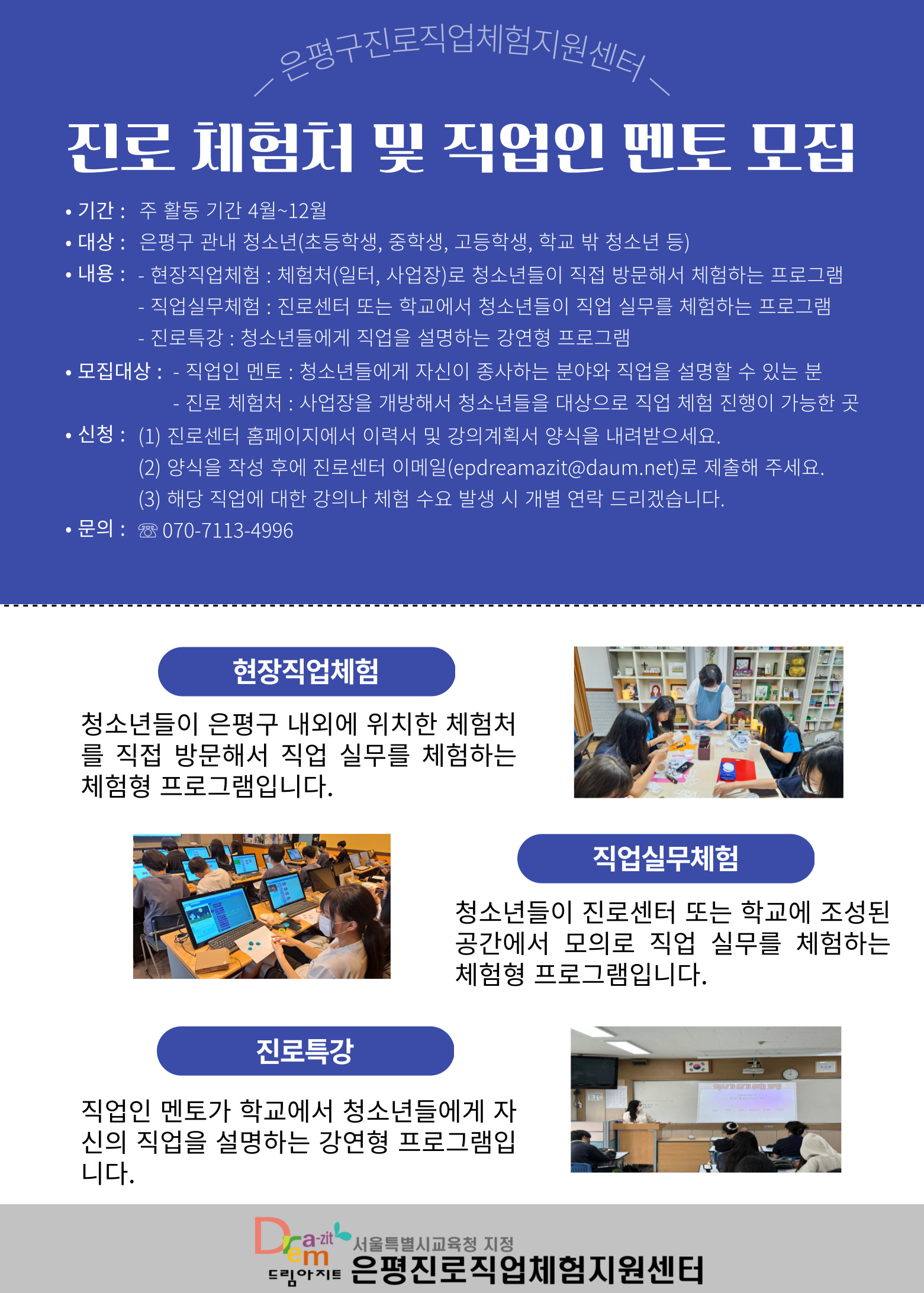 <ÀºÆò±¸Áø·ÎÁ÷¾÷üÇèÁö¿ø¼¾ÅÍ Áø·Î üÇèó ¹× Á÷¾÷ÀÎ ¸àÅä »ó½Ã ¸ðÁý> ¡á Ȱµ¿ ±â°£: 4¿ù ~ 12¿ù ¡á ¿î¿µ ³»¿ë - ÇöÀåÁ÷¾÷üÇè : üÇèó(ÀÏÅÍ, »ç¾÷Àå)·Î û¼Ò³âµéÀÌ Á÷Á¢ ¹æ¹®Çؼ üÇèÇÏ´Â ÇÁ·Î±×·¥ ¡Ø±³À°ºÎ Áø·ÎüÇè¸Á '²Þ±æ' »çÀÌÆ®³» °¡ÀÔ ¹× üÇèó µî·Ï Çʼö - Á÷¾÷½Ç¹«Ã¼Çè(¸ðÀÇÁ÷¾÷üÇè) : Áø·Î¼¾ÅÍ ¶Ç´Â Çб³¿¡¼ û¼Ò³âµéÀÌ Á÷¾÷ ½Ç¹«¸¦ üÇèÇÏ´Â ÇÁ·Î±×·¥ - Áø·ÎƯ°(Á÷¾÷ÀÎÆ¯°) : û¼Ò³âµé¿¡°Ô Á÷¾÷À» ¼³¸íÇÏ´Â °¿¬Çü ÇÁ·Î±×·¥ ¡á ¸ðÁý ´ë»ó - Á÷¾÷ÀÎ ¸àÅä : û¼Ò³âµé¿¡°Ô ÀÚ½ÅÀÌ Á¾»çÇÏ´Â ºÐ¾ß¿Í Á÷¾÷À» ¼³¸íÇÒ ¼ö ÀÖ´Â ºÐ - Áø·Î üÇèó : »ç¾÷ÀåÀ» °³¹æÇؼ û¼Ò³âµéÀ» ´ë»óÀ¸·Î Á÷¾÷ üÇè ÁøÇàÀÌ °¡´ÉÇÑ °÷