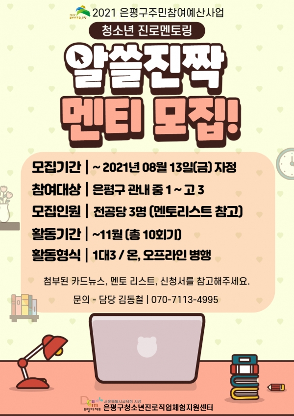 ¡à »ç ¾÷ ¸í : 2021 û¼Ò³â Áø·Î ¸àÅ丵 '¾Ë¾µÁøÂ¦'(¾Ë¾ÆµÎ¸é ¾µ¸ðÀÖ´Â Áø·Î¸àÅ丵 '¦±Ã') ¡à Âü¿©´ë»ó : ÀºÆò±¸ °ü³» ÁßÇб³ 1Çг⠺ÎÅÍ °íµîÇб³ 3Çгâ Çлý ¡à ¸ðÁýÀοø : Àü°ø´ç 3¸í - ÁÖº¯ Ä£±¸µé¿¡°Ôµµ ÃßõÇÏ¿© ÇÔ²² Âü¿©Çϼ¼¿ä~ - ´ëÇлý¸àÅä ¸®½ºÆ®¿¡ ³ª¿Í ÀÖ´Â Àü°øº° Âü¿© °¡´ÉÇÑ Çгâ°ú ¼ºº°À» ²À È®ÀÎ ÈÄ ½ÅÃ»ÇØÁֽñ⠹ٶø´Ï´Ù. ¡à ¸ðÁý±â°£ : 2021. 08. 29 (ÀÏ) ÀÚÁ¤±îÁö - ¸ðÁý ¿Ï·á ÈÄ ¸àÅä¿Í ¸àƼ°¡ Áø·Î¼¾ÅÍ¿¡¼ ¸¸³ª ¿¬°£ ÀÏÁ¤À» °èȹÇÕ´Ï´Ù.