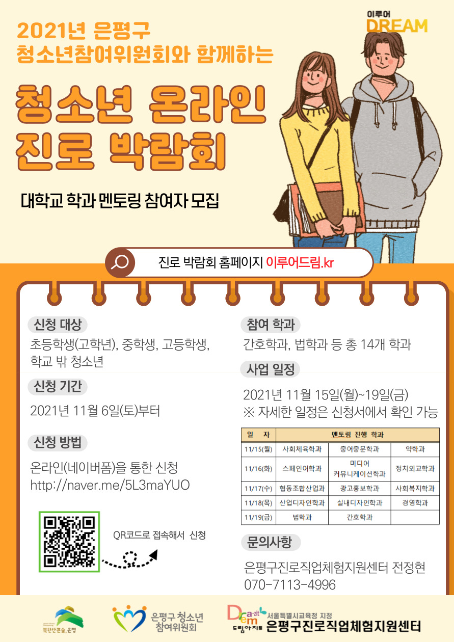 2021³â ÀºÆò±¸ û¼Ò³âÂü¿©À§¿øÈ¸¿Í ÇÔ²²Çϴ û¼Ò³â ¿Â¶óÀÎ Áø·Î ¹Ú¶÷ȸ - ÀÌ·ç¾î'µå¸²(dream)'ÀÇ ´ëÇб³ Çаú ¸àÅ丵 ÇÁ·Î±×·¥¿¡ Âü¿©ÇÒ Ã»¼Ò³âµéÀ» ¸ðÁýÇÕ´Ï´Ù.