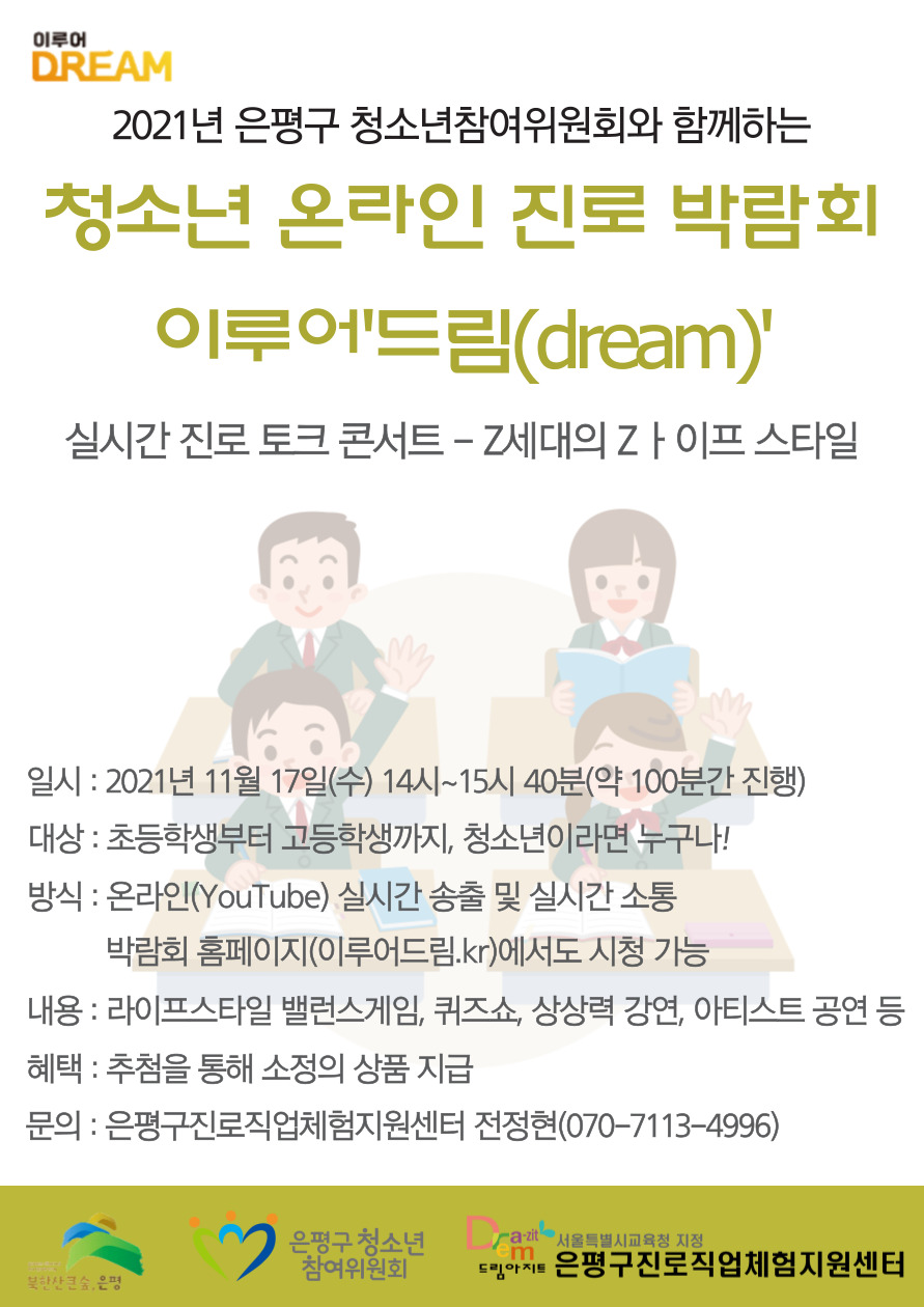 2021³â ÀºÆò±¸ û¼Ò³âÂü¿©À§¿øÈ¸¿Í ÇÔ²²Çϴ û¼Ò³â ¿Â¶óÀÎ Áø·Î ¹Ú¶÷ȸ - ÀÌ·ç¾î'µå¸²(dream)'ÀÇ ½Ç½Ã°£ Áø·Î ÅäÅ© ÄܼƮ¿¡ Âü¿©ÇÒ Ã»¼Ò³âµéÀ» ¸ðÁýÇÕ´Ï´Ù. Áø·Î ÅäÅ© ÄܼƮ »çÀü ¼ö¿ä¸¦ À§ÇÑ ½ÅûÀÔ´Ï´Ù.