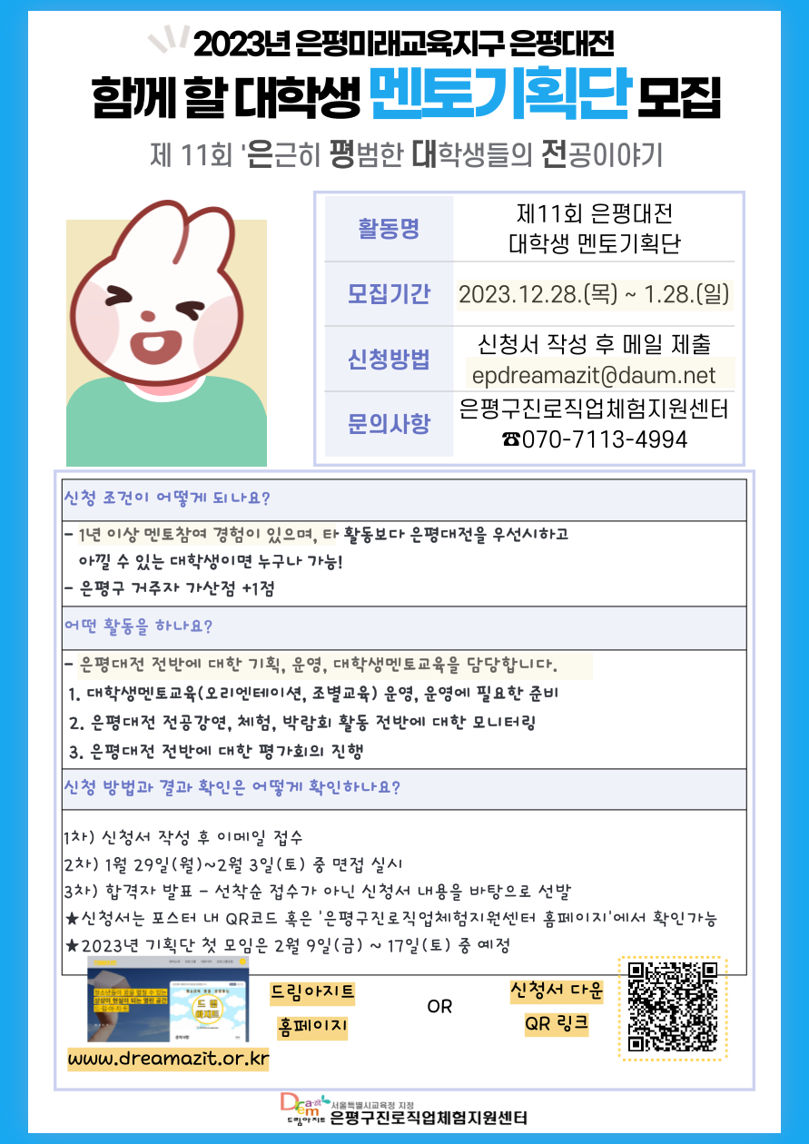 ¡ß ¸ðÁý±â°£: 2023³â 12¿ù 28ÀÏ(¸ñ) ~ 2024³â 01¿ù 28ÀÏ(ÀÏ) 00:00±îÁö ¡ß ¸éÁ¢ÀÏÁ¤: 2024³â 01¿ù 29ÀÏ(¿ù) ~ 2024³â 02¿ù 03ÀÏ(Åä) Áß ½Ç½Ã ¡Ø ù ¸ðÀÓÀº 02¿ù 09ÀÏ(±Ý) ~ 17ÀÏ(Åä) Áß ½Ç½Ã ¿¹Á¤ ¡ß ½É»ç¾È³»: ¸àÅä·Î Âü°¡ 1³â ÀÌ»ó °æÇèÀÚ, ÀºÆò´ëÀüÀ» ÇÔ²² ±âÈ¹ÇØº¸°í ½ÍÀº Ã¥ÀÓ°¨¡¤¸®´õ½Ê ÀÖ´Â ÀÚ 1Â÷ ½Åû¼ ±â¹Ý ¼·ùÆò°¡ ¡æ 2Â÷ ¸éÁ¢(´ëÈ ±â¹Ý) ¡æ ÇÕ°Ý¿©ºÎ °³º°¿¬¶ô ¡ß Ȱµ¿³»¿ë: ¸àÅä±³À°(O.T, Á¶º°±³À°) ±âȹ ¹× ¿î¿µ / Àü°ø°¿¬-üÇè-¹Ú¶÷ȸ Ȱµ¿ Áغñ ¹× ¸ð´ÏÅ͸µ / ÇÁ·Î±×·¥ Àü¡¤ÈÄ ±âȹ¡¤Æò°¡È¸ÀÇ, ±× ¿Ü Ä£¸ñ¸ðÀÓ µî ¡ß Áö¿ø¹æ¹ý: ¾Æ·¡ ½Åû¼ ÀÛ¼º ÈÄ À̸ÞÀÏ Á¦Ãâ (epdreamazit@daum.net) ¡Ø ¼±Âø¼ø Á¢¼ö°¡ ¾Æ´Ñ, ½Åû¼¿Í Áö³ Ȱµ¿³»¿ëÀ» ¹ÙÅÁÀ¸·Î ¼±¹ßµÇ¸ç ÇÕ°ÝÀÚ´Â °³º° Å뺸µË´Ï´Ù. ¡ß ÀÛ¼º¿ä·É: (1) ÀÎÀû»çÇ×À» 2024³â ±âÁØÀ¸·Î ±âÀÔÇØÁֽñ⠹ٶø´Ï´Ù. (2) ÀÚ±â¼Ò°³¼¿¡ »çÁøÀº ÇÕ°Ý ÈÄ ´ëÇлý¸àÅä±âȹ´Ü ¸íÇÔ, ¸íÂû Á¦ÀÛÀ» À§ÇØ ¾²ÀÏ ¿¹Á¤ (3) ½Åû¼ÀÇ ±æÀÌ º¸´Ù´Â ³»¿ëÀ» Áß½ÉÀ¸·Î Æò°¡ÇÒ ¿¹Á¤ÀÌ´Ï ÀÚ½ÅÀÇ »ý°¢À» ÁßÁ¡ÀûÀ¸·Î ÀÛ¼º (4) ¡°1.2024 ´ëÇлý ¸àÅä±âȹ´Ü ½Åû¼(À̸§_Çаú)¡± ÇÑ±ÛÆÄÀϰú ¡°2. »çÁø(À̸§_Çаú)¡± À̹ÌÁö ÆÄÀÏ ÇÔ²² Á¦Ãâ