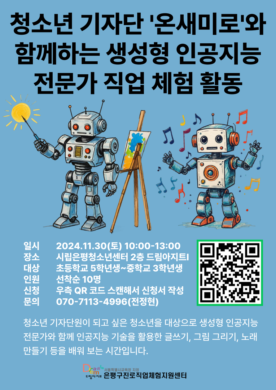 ÀºÆò±¸Áø·ÎÁ÷¾÷üÇèÁö¿ø¼¾ÅÍ ¡¯µå¸²¾ÆÁöÆ®¡¯¿¡¼ ¿î¿µÇϴ û¼Ò³â ±âÀÚ´Ü ¡¸¿Â»õ¹Ì·Î¡¹¿¡¼´Â û¼Ò³â ±âÀÚ´Ü È°µ¿¿¡ °ü½É ÀÖ´Â, ¿¹ºñ û¼Ò³â ±âÀÚ´Ü¿ø û¼Ò³âÀ» ´ë»óÀ¸·Î »ý¼ºÇü ÀΰøÁö´É Àü¹®°¡ üÇè Ȱµ¿À» ÁøÇàÇϰíÀÚ ÇÕ´Ï´Ù.