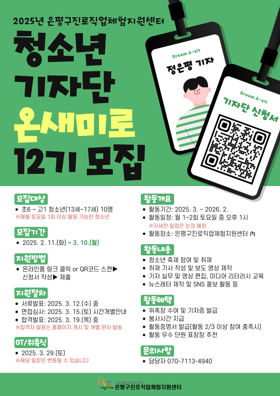 ¾È³çÇϼ¼¿ä. ÀºÆò±¸Áø·ÎÁ÷¾÷üÇèÁö¿ø¼¾ÅÍ 'µå¸²¾ÆÁöÆ®'ÀÔ´Ï´Ù. 2025³â û¼Ò³â ±âÀÚ´Ü ¡¸¿Â»õ¹Ì·Î¡¹ 12±â ½Å±Ô ´Ü¿øÀ» ´ÙÀ½°ú °°ÀÌ ¸ðÁýÇÕ´Ï´Ù.