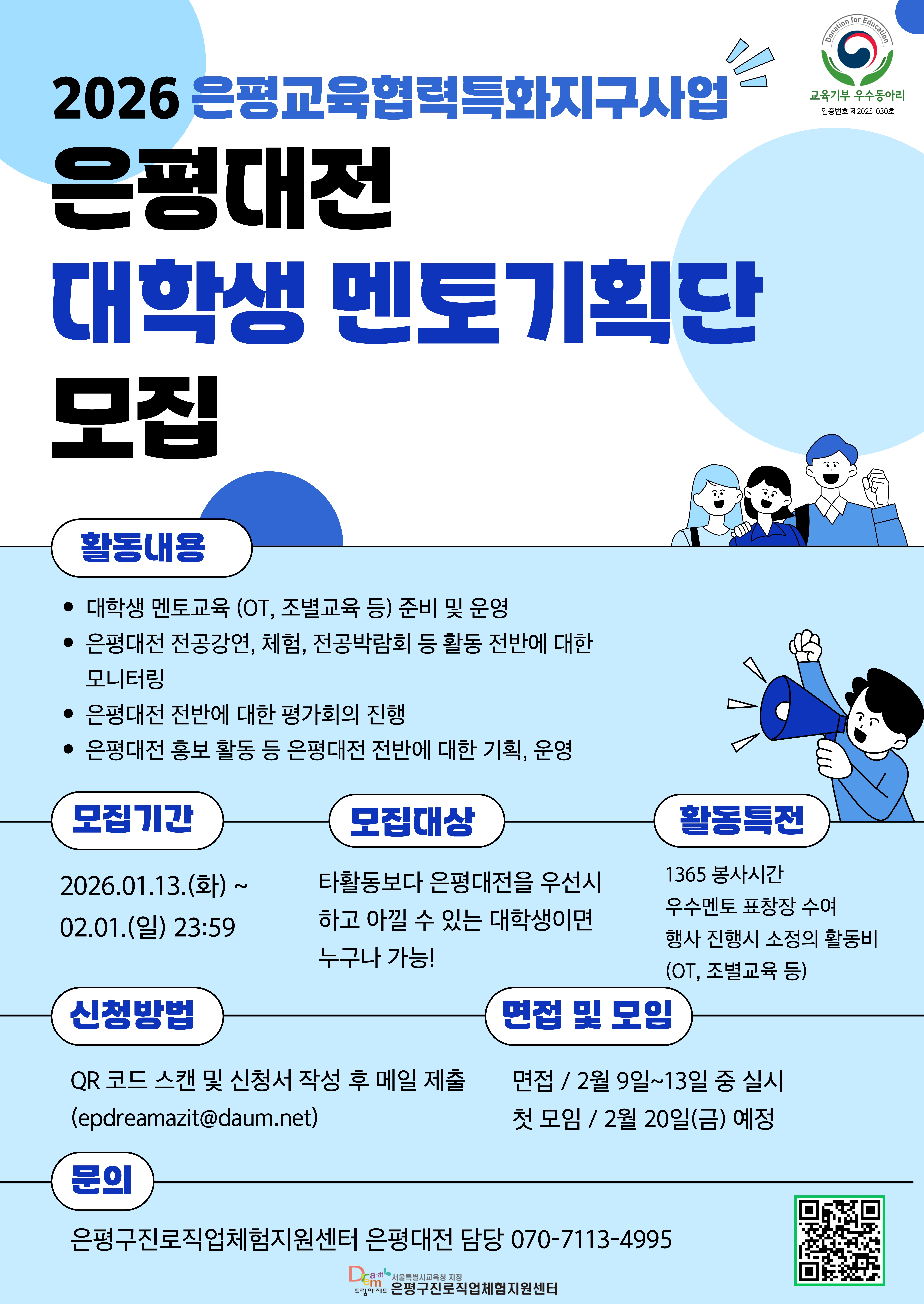 ÀÌÀü±Û [¸ðÁýÁß] 2026³â ÀºÆò±³À°Çù·ÂƯȭÁö±¸»ç¾÷ Á¦ 13ȸ ¡¸ÀºÆò´ëÀü ¡¹¿¡ Âü¿©ÇÒ ´ëÇлý ¸àÅ並 ¸ðÁýÇÕ´Ï´Ù!(~3¿ù 26ÀϱîÁö)